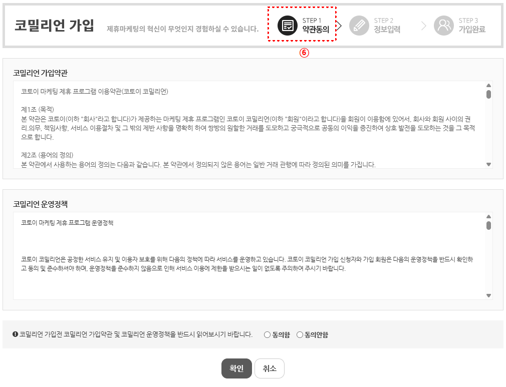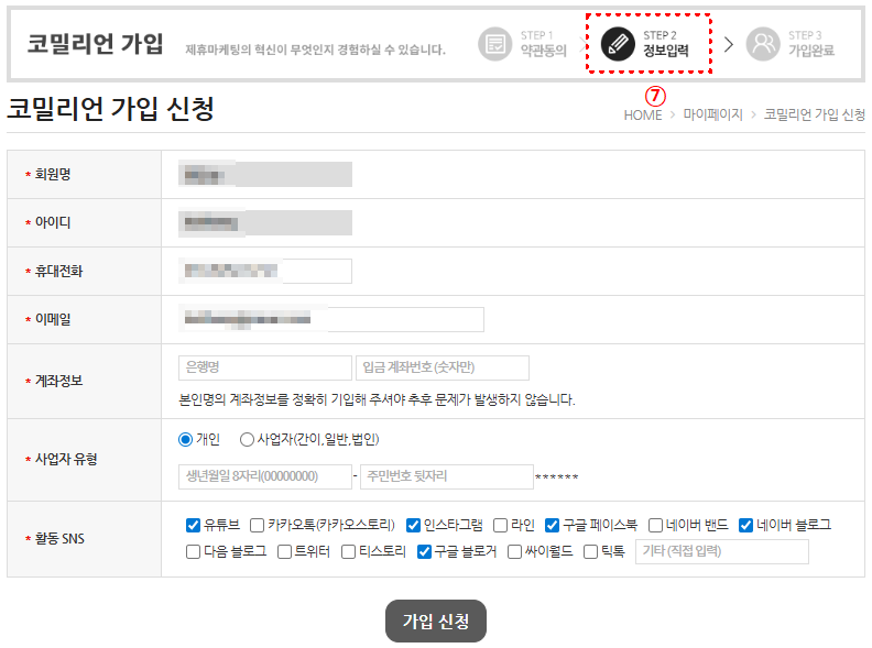 회원가입 후, 로그인이 된 상태에서 마이페이지로 이동하면 좌측과 같은 메뉴가 있는데, 가장 아래 부분에 '코밀리언 가입' 메뉴가 있습니다.